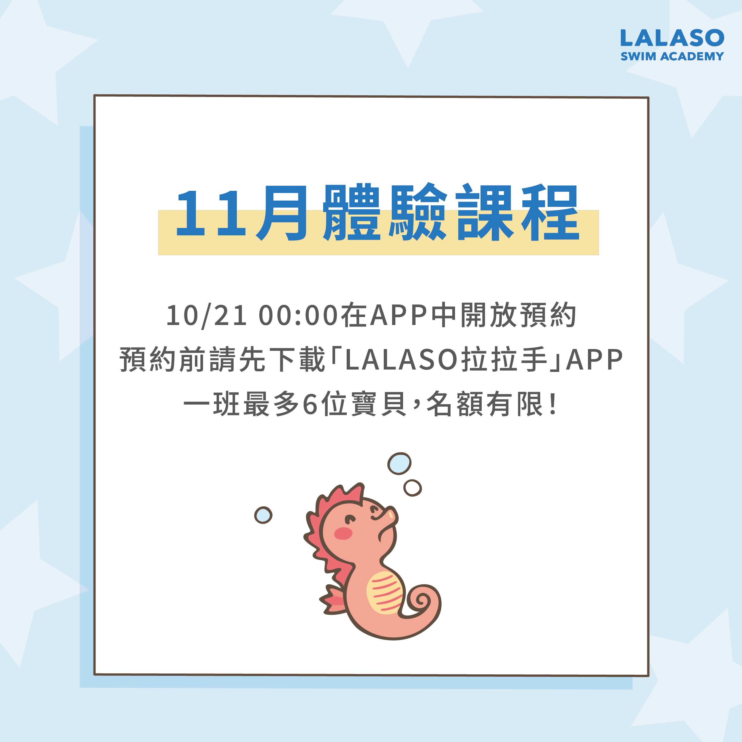 📢 重要提醒【11月體驗課預約】 10/21 00:00開放預約 (注意:是10/20跨10/21的凌晨) 預約前請先下載「LALASO拉拉手」APP 一班最多6位寶貝,名額有限,趕快報名吧! ⛧已有親子平日折扣碼的家長要記得使用唷! 𓂃𓂃𓂃𓂃𓂃𓂃𓂃𓂃 三種課程皆享首次體驗價 ⭐️請選名稱有「體驗」之課程 ⭐️假日體驗搶手!請務必準時預約 體驗課程時段表,實際可預約時段依APP為主⬇️ 𓂃𓂃𓂃𓂃𓂃𓂃𓂃𓂃 【體驗APP下載連結】 IOS: https://apple.co/3rApdWf Android: https://bit.ly/3Im1FKP 【預約教學👇】 https://lalasobaby.com/uncategorized/reservation/ 𓂃𓂃𓂃𓂃𓂃𓂃𓂃𓂃 如有任何操作上的疑問,或是不清楚孩子適合參加哪一堂體驗課程,歡迎聯繫行政老師: 官方LINE 西屯館:https://lin.ee/myY23RZ 北屯館:https://lin.ee/L7sbfmN 門市詢問 請撥打:04-3702-3937 西屯館分機#1 北屯館分機#2 【服務時間如下】 週一|公休日 週二|09:00~21:00 週三|09:00~21:00